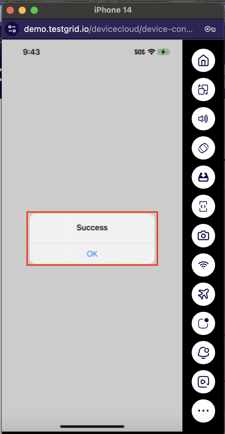 After completing the installation of any testing app, you can choose the “Pass” radio button and verify to see a success message in the top-right corner of the screen. This will indicate that the biometric authentication case has been bypassed in your app.