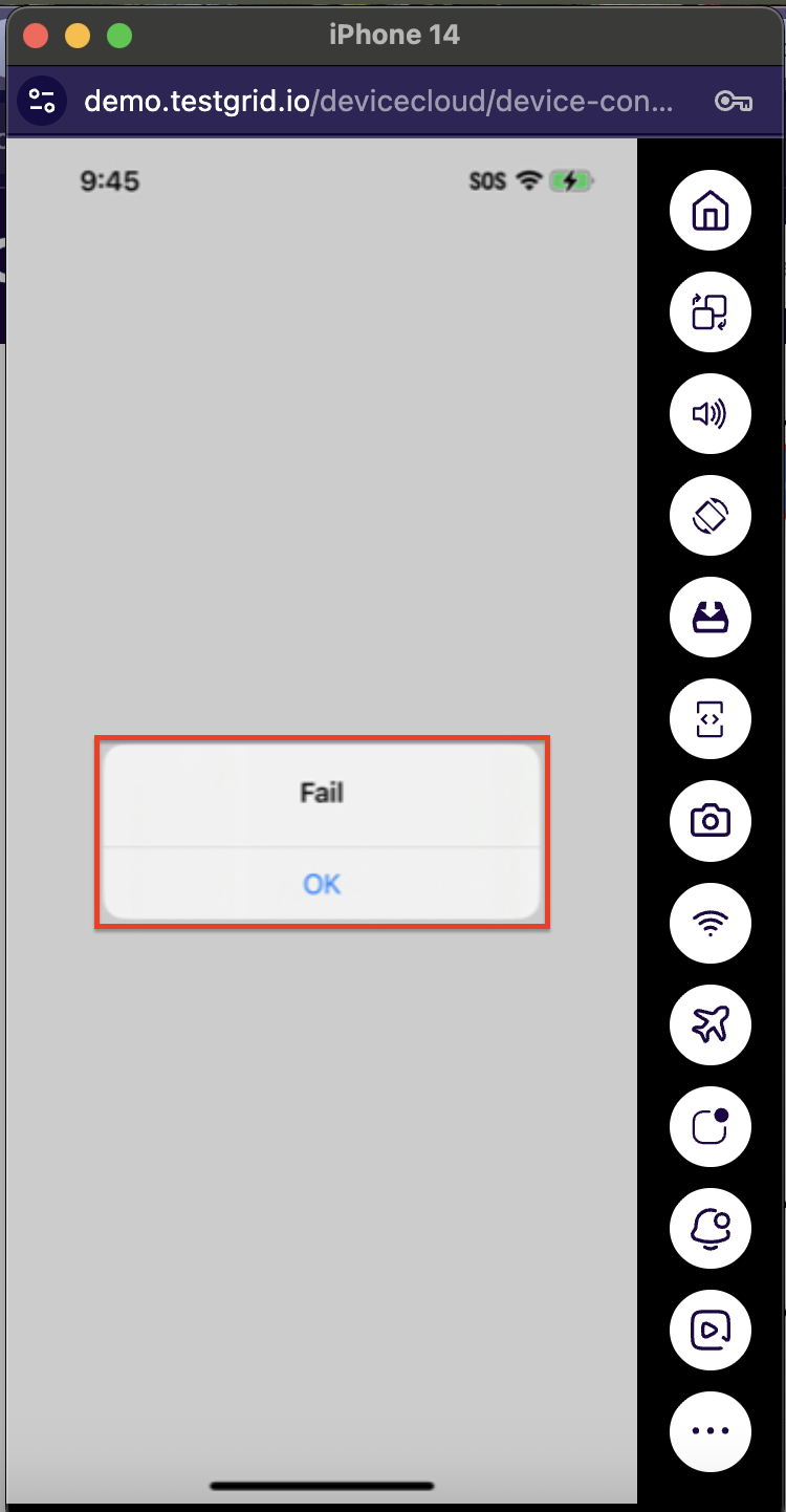 After completing the installation of any testing app, you can choose the “Fail” radio button and verify to see a failure message in the popup on the screen. This will indicate that the biometric authentication case has not been bypassed and the scenario test has failed in your app.