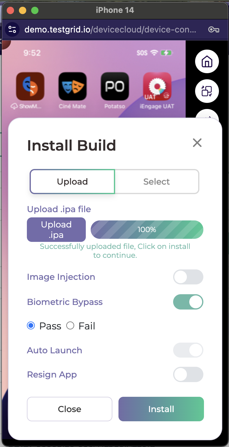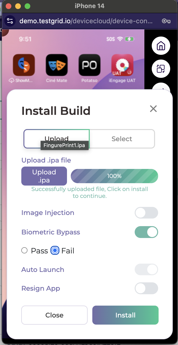 Step 2: Select “Biometric Bypass” and upload the IPA/APK file. Click on Install and verify it.