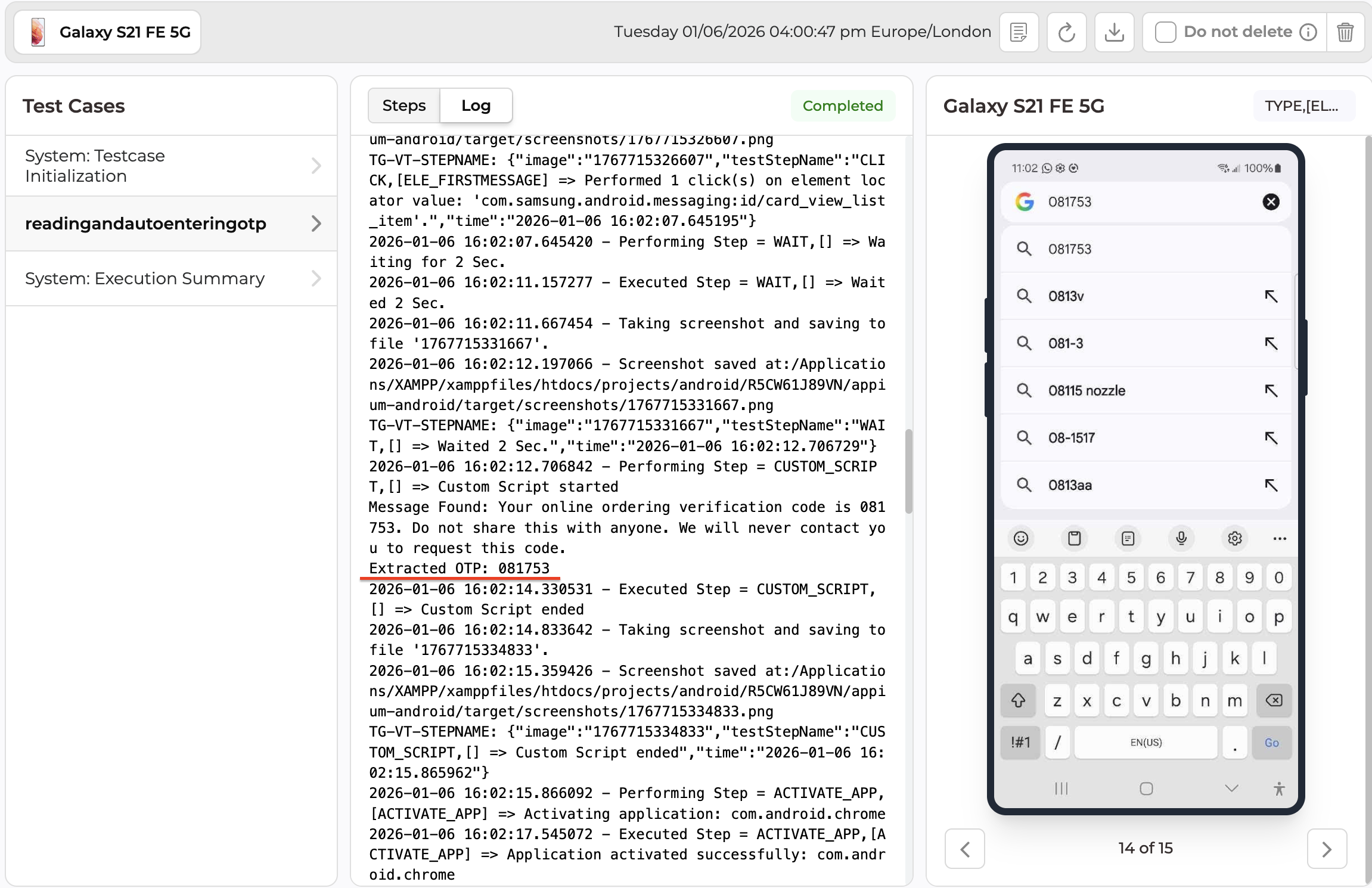 - Auto-enter the OTP during test execution on TestGrid Real Android Devices