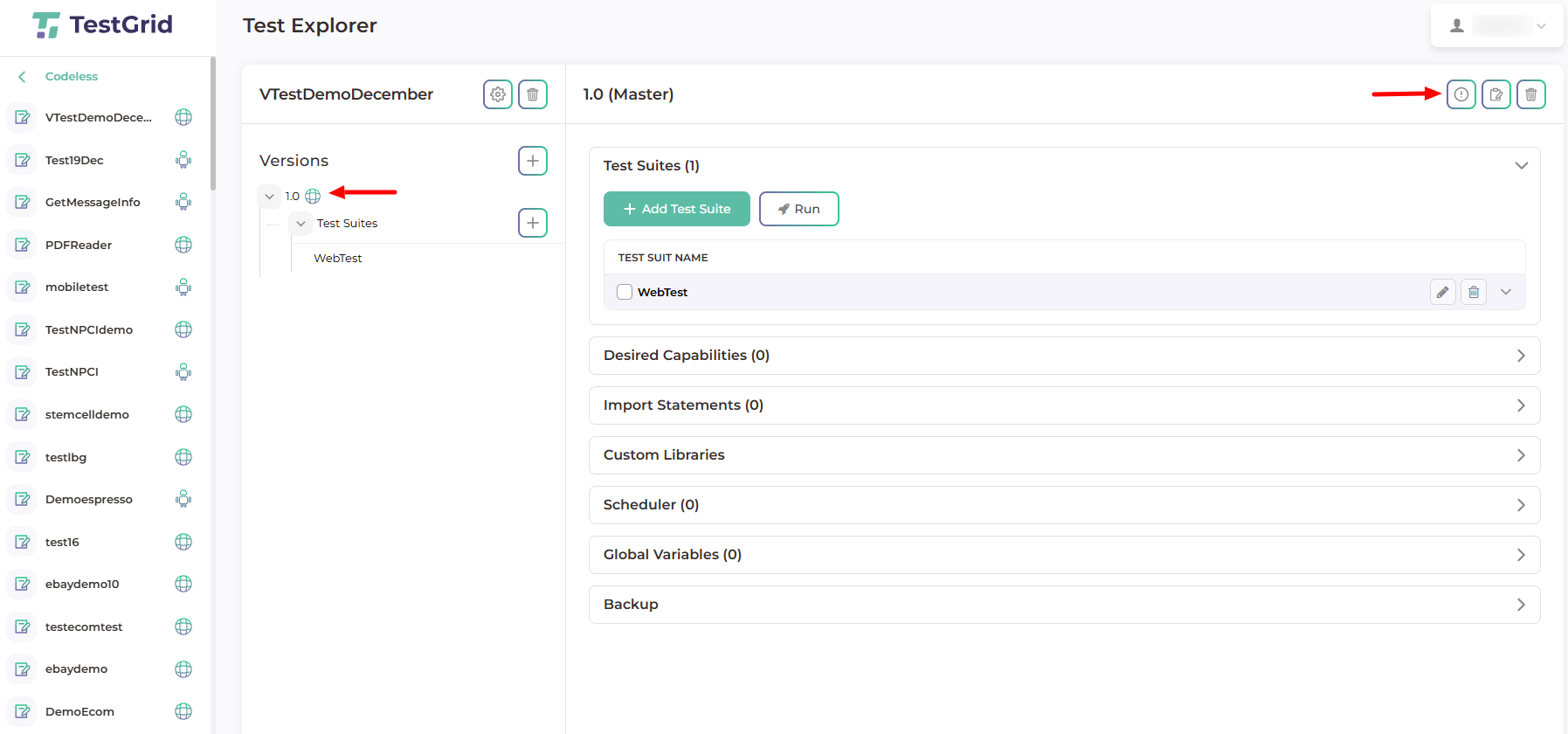 a. Go to the Dashboard and then click on “Codeless.” After that, click on “Test Case Writer” and then click on “Versions.” On the same screen, look for the “i” button in the upper right corner.