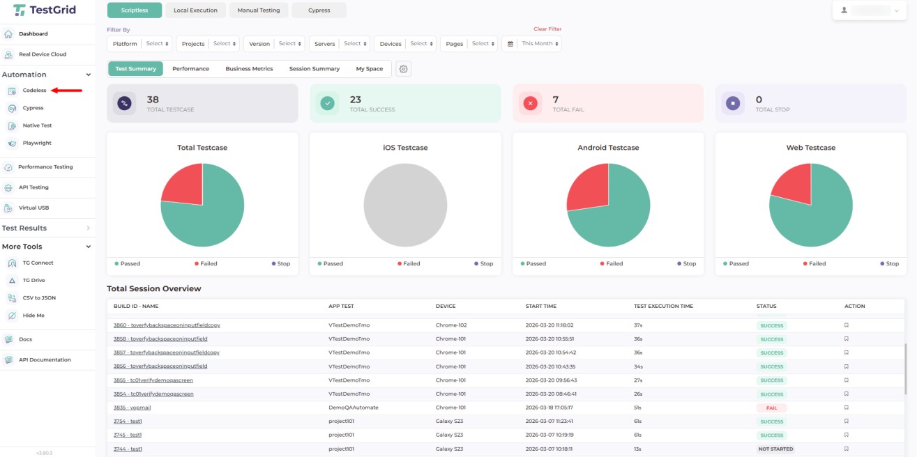 Step No. 1- Log in to the TestGrid portal using your valid credentials and get started with Scriptless/Codeless Automation.