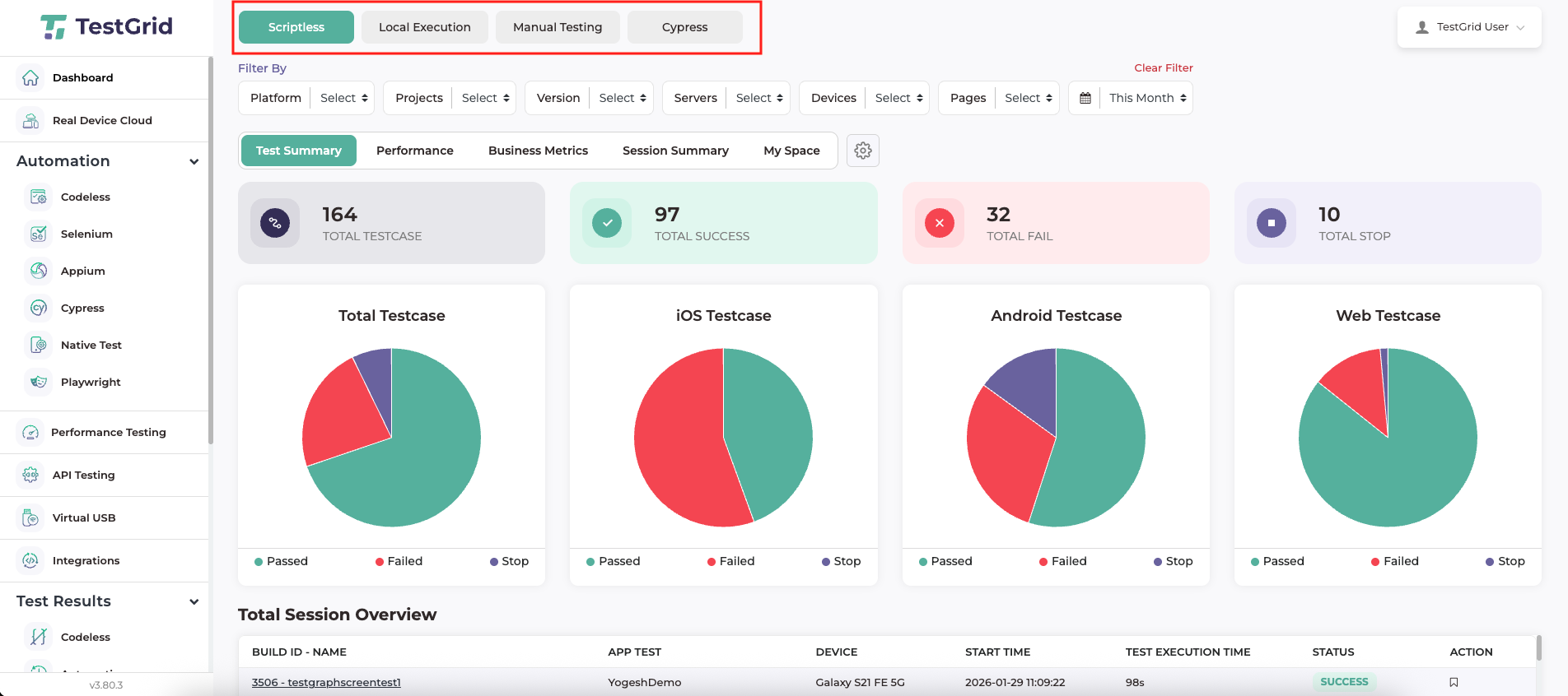 TestGrid provides a unified reporting framework for all testing activities executed within the platform. Reports are organised by testing type, ensuring that each execution category is presented in its own dedicated view. The dashboard supports reporting for Local Execution, Scriptless Testing, Manual Testing, and Cypress Automation, with each view displaying data relevant only to the selected testing method.