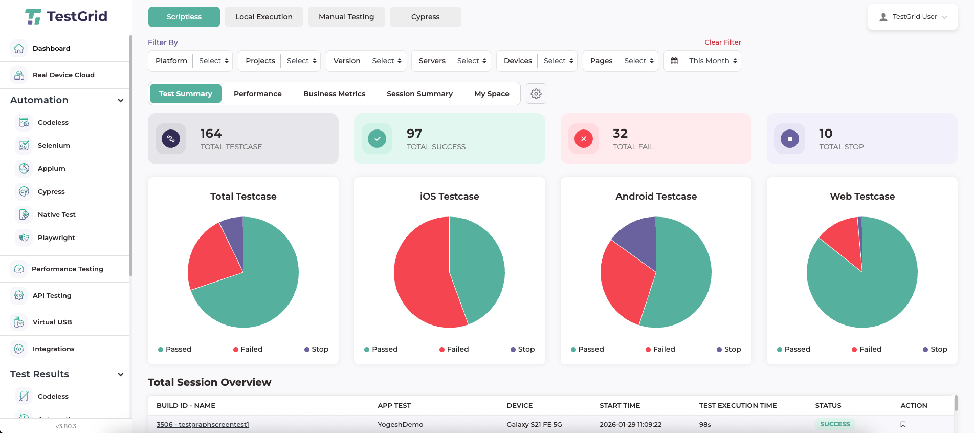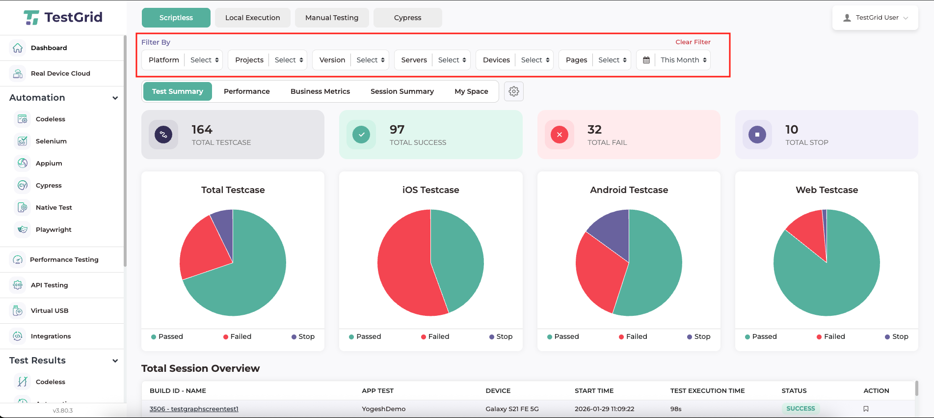 The TestGrid Dashboard provides a comprehensive set of filters that allow users to refine and customise test reports based on specific criteria. These filters help users focus on relevant test execution data and perform targeted analysis across projects, platforms, devices, and time ranges.