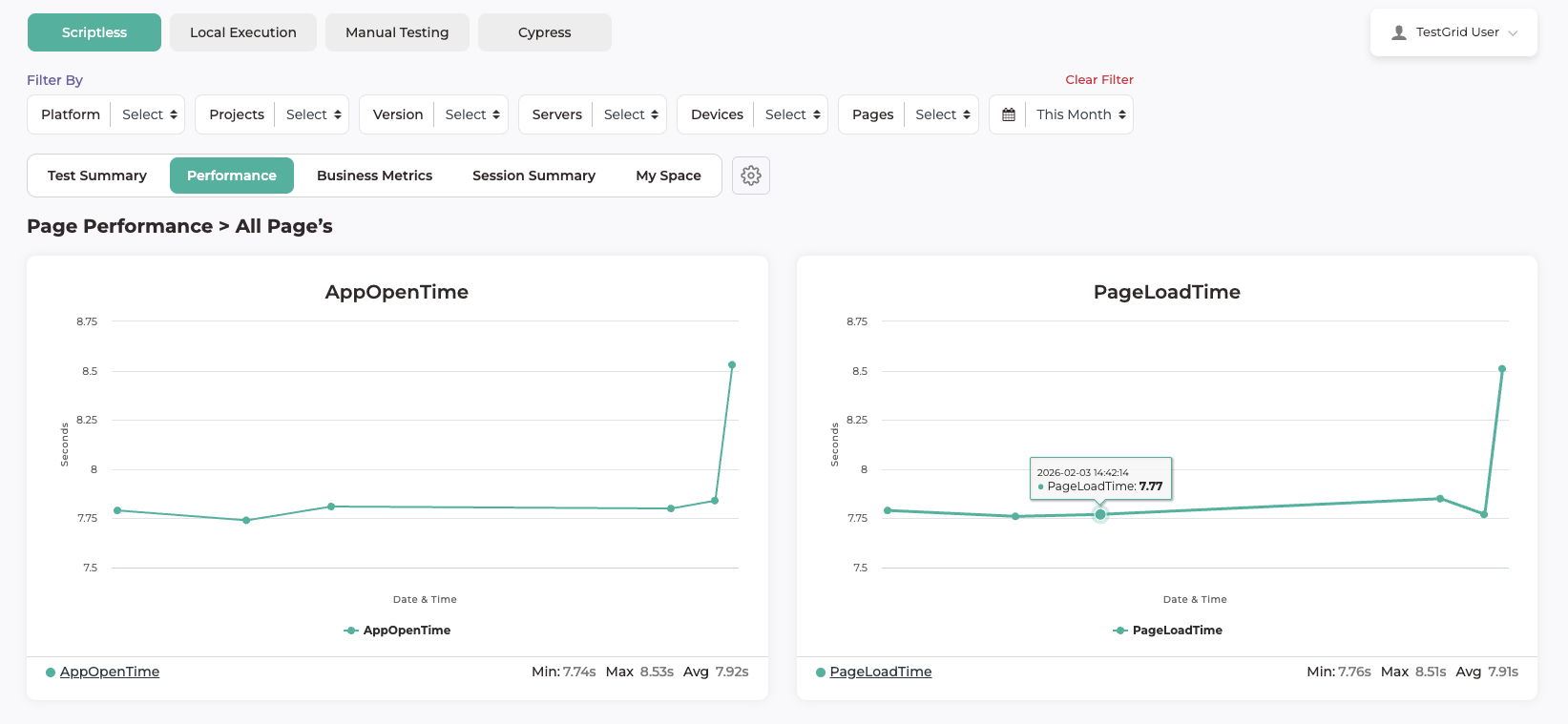 - The Performance section provides insights into application behaviour during test execution by measuring page load start and page load end keywords. It helps users understand how efficiently the application responds and completes actions during test runs. These metrics enable evaluation of test step execution speed and overall application responsiveness.