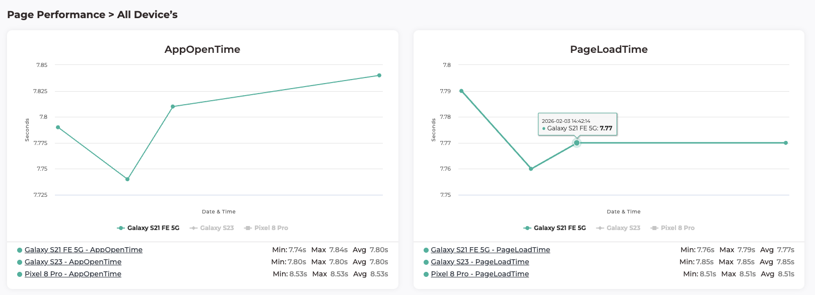 This view presents page performance data across all devices used during test execution. It allows users to analyse how page load times vary on individual device models and identify device-specific performance issues.