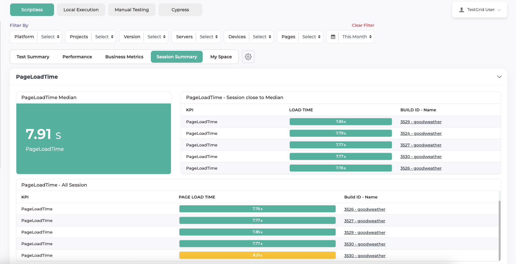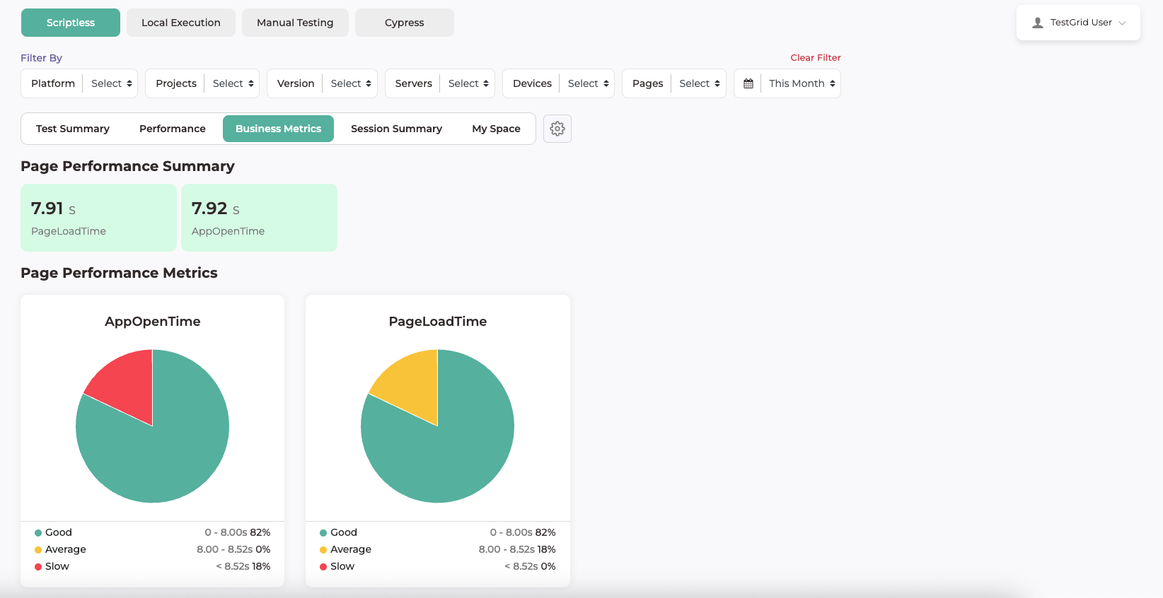 Page Performance ViewsTestGrid provides multiple-page performance views to help users analyse application performance from different perspectives. These views present page load metrics using visual charts for effective comparison and analysis.