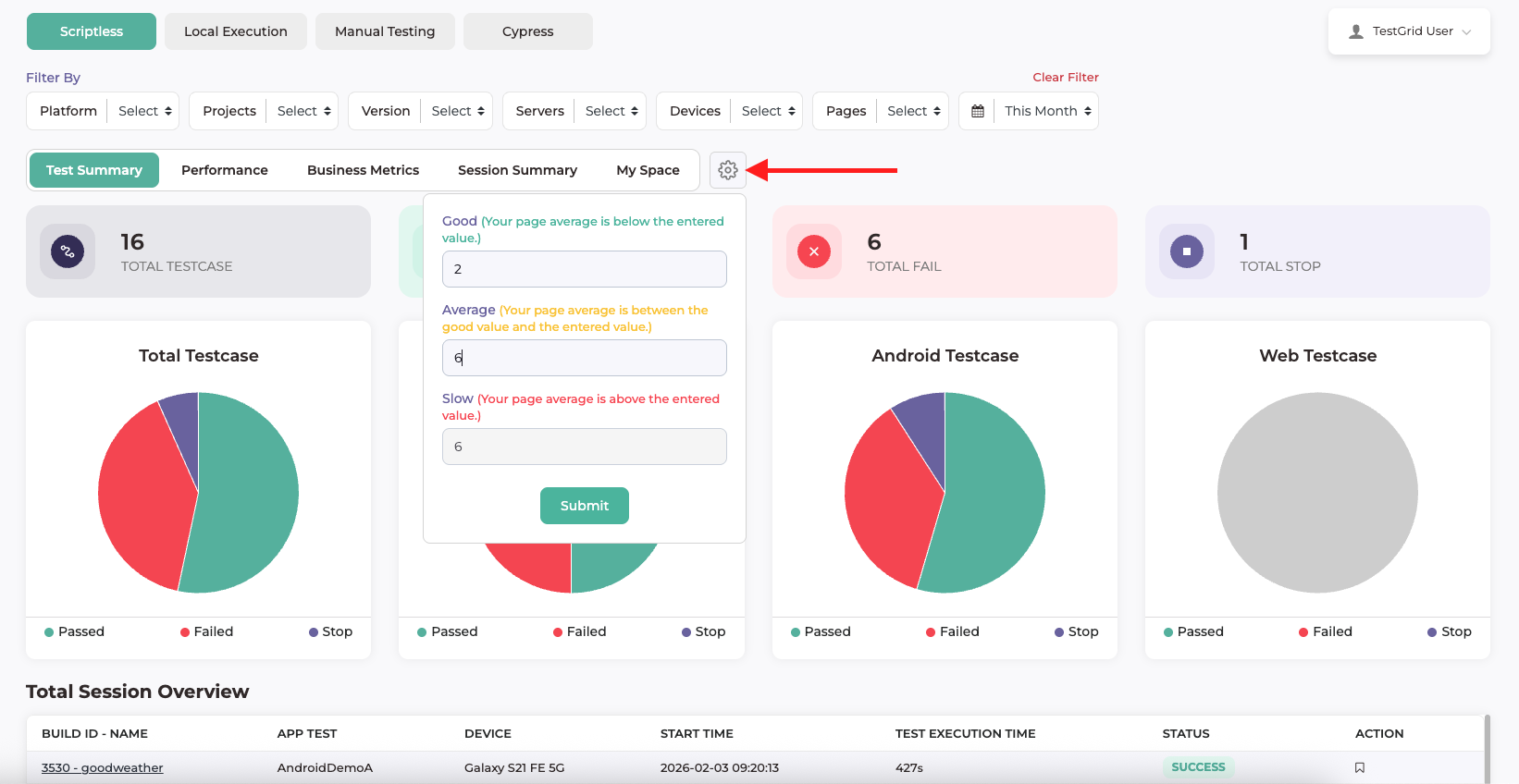After updating the values and clicking Submit, all performance metrics, charts, and summaries across the dashboard are updated based on the configured thresholds. This allows users to align performance evaluation with their application’s expectations and performance standards.