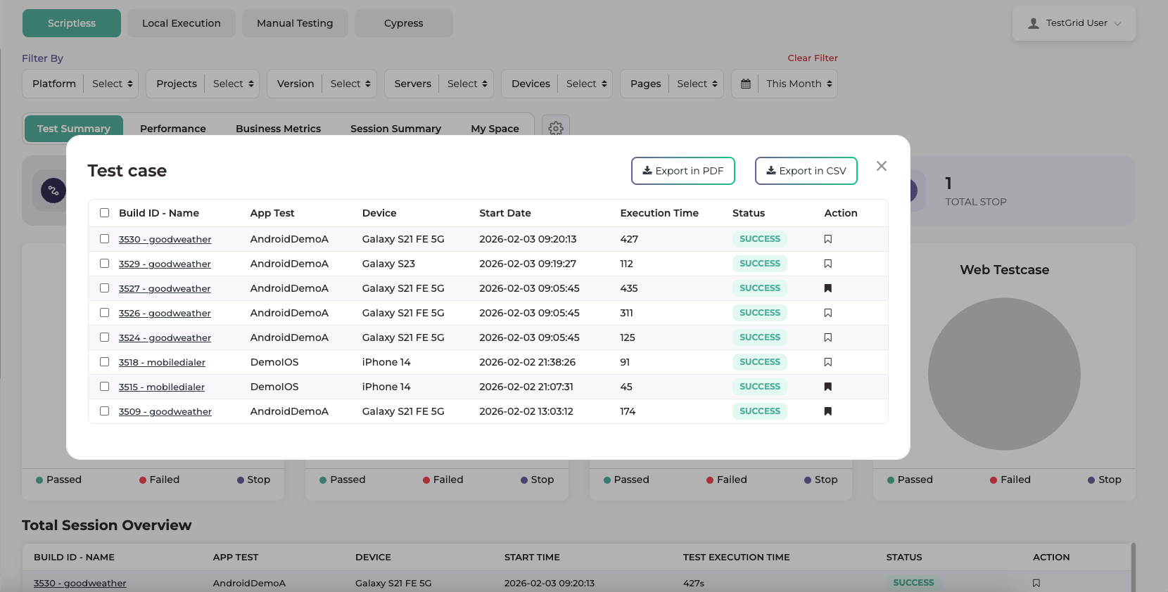 The screenshot below illustrates that Clicking on Total Success displays the list of successfully executed test cases. From this view, users can export the results in CSV or PDF format. Additionally, users can open an individual test case to view detailed execution results.