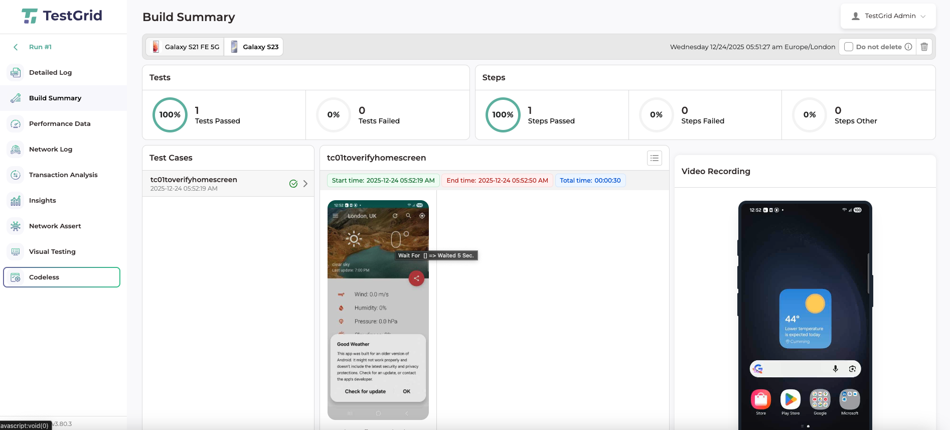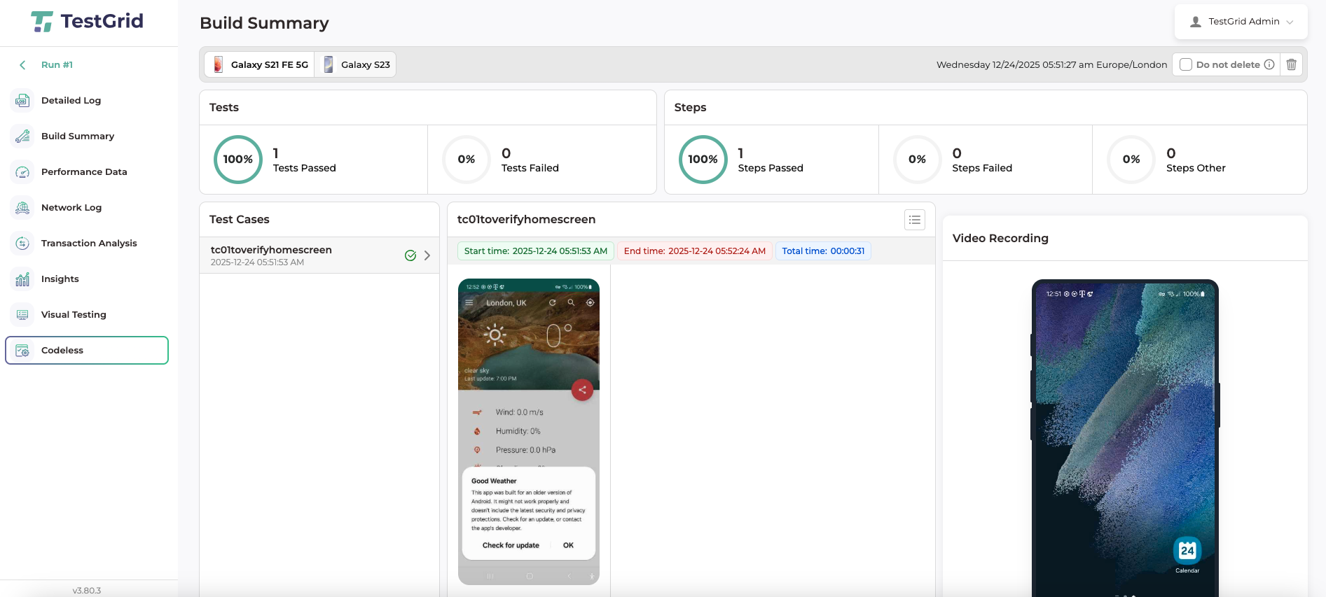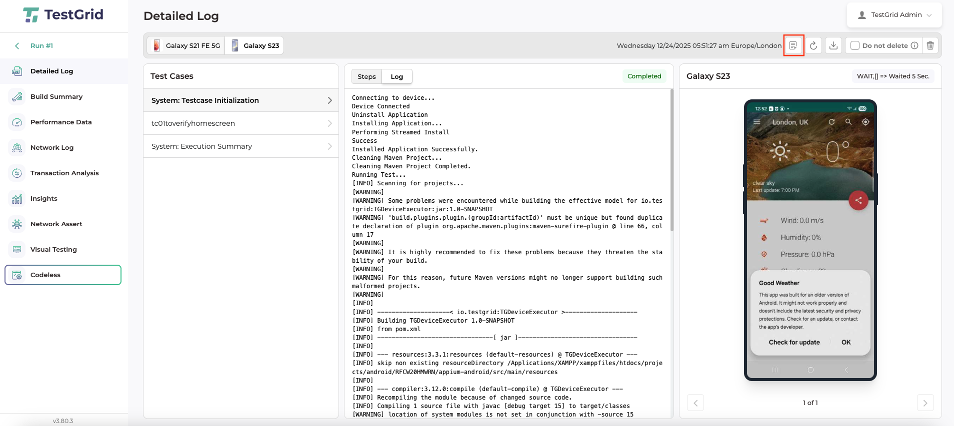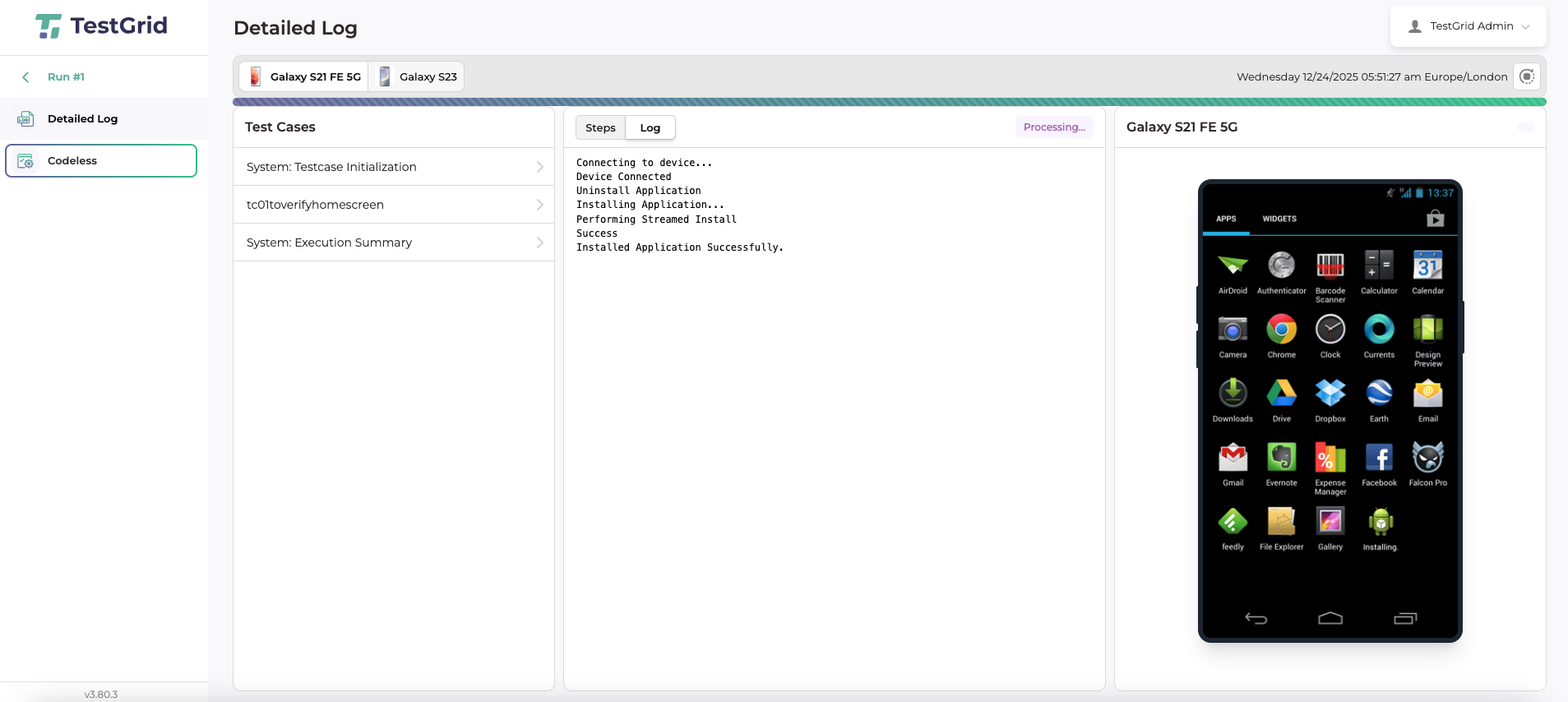 You can view the selected test cases, logs, and results of the executed test cases on the chosen device tabs.