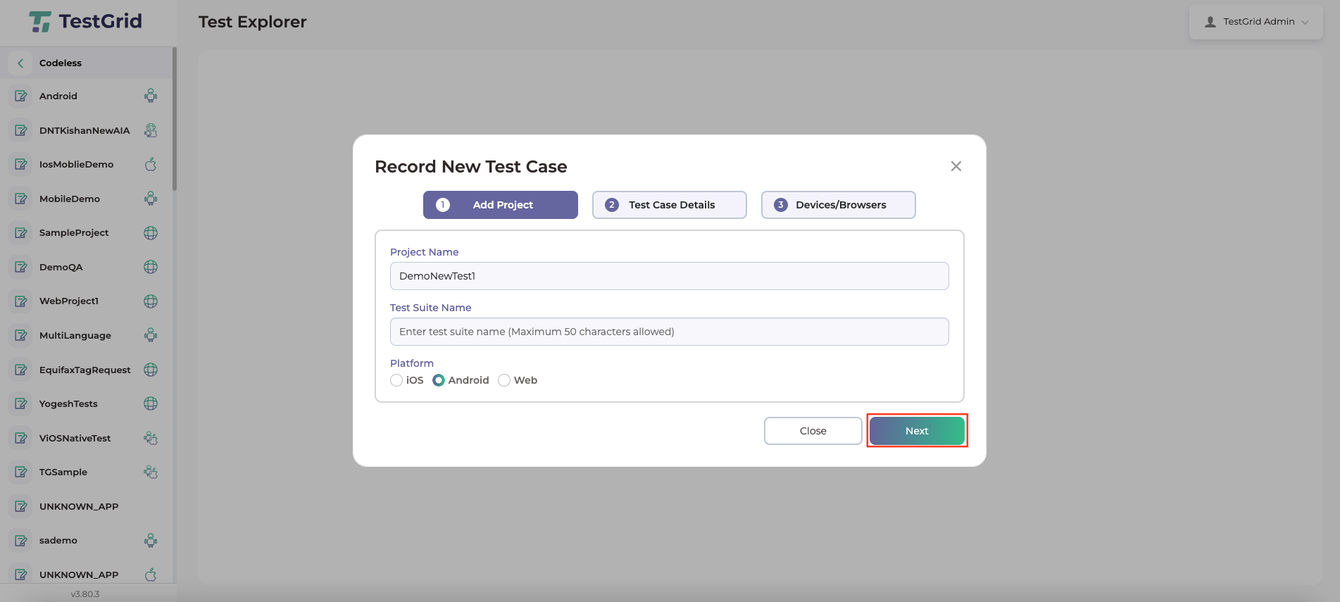 - Provide the name for the new project that is to be created. Select the specific platform for which the test cases are to be created, like iOS, Android or Web. Finally click on the “Next” button.
