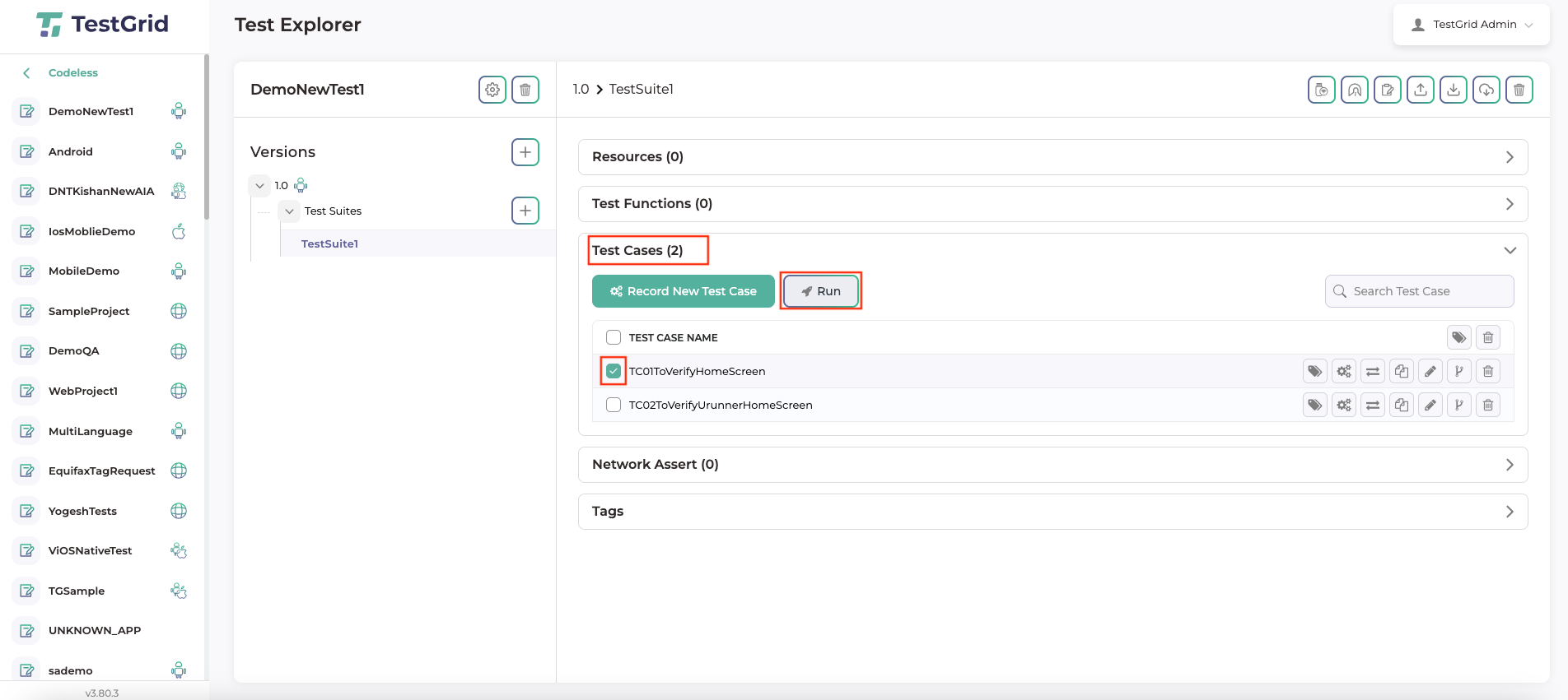 Step 3. Select the test case for execution, then click the Run button as highlighted below.