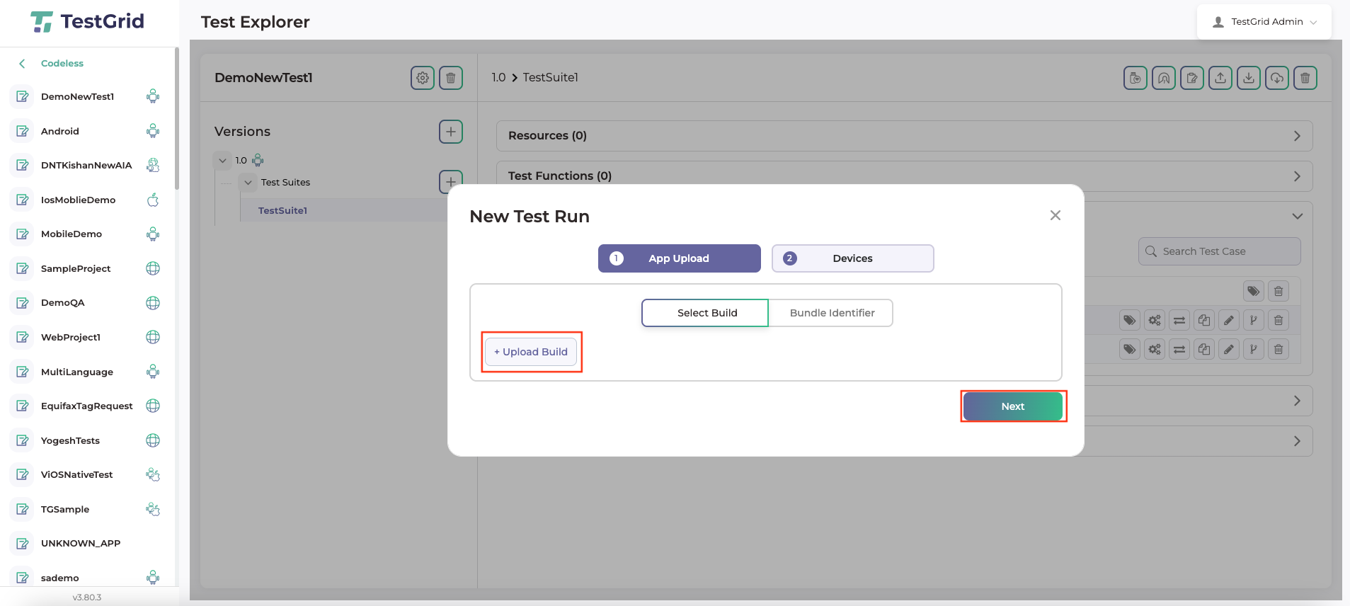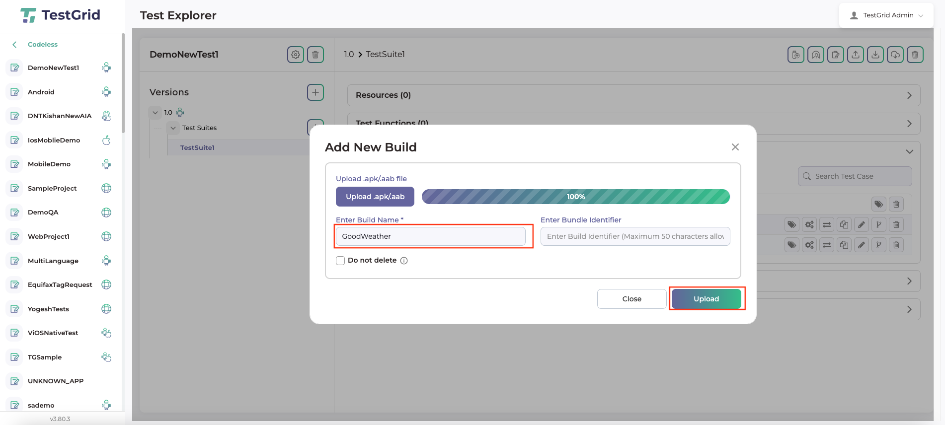 - Click on the upload build button and upload the specific build for which test case is to be created.